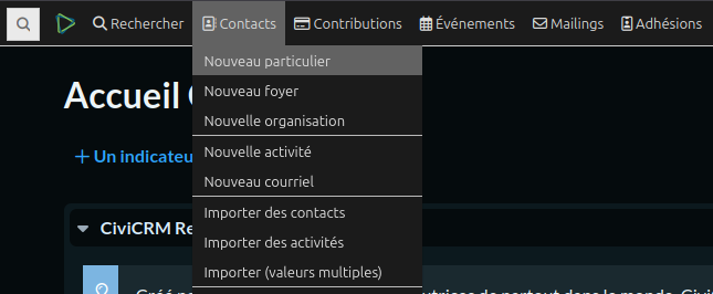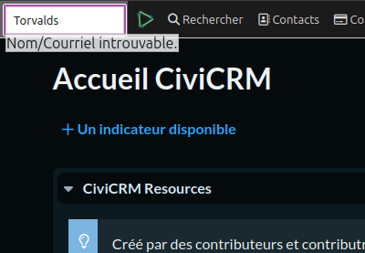 En haut à gauche de CiviCRM, vous avez un champ qui vous permet de rechercher parmi les contacts. Taper le nom de famille de l'adhérent.e. Si rien n'est trouvé, c'est qu'il va falloir créer le contact.